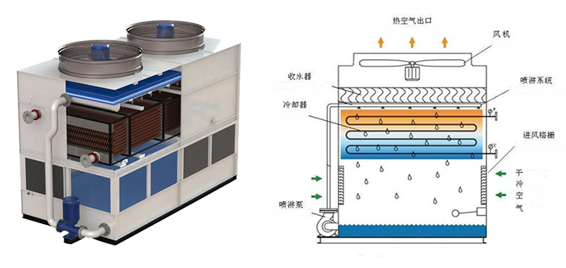 高溫工作流體進(jìn)入表冷器,廢熱通過盤管外壁與下落的噴淋水接觸進(jìn)行熱質(zhì)交換并與底部進(jìn)風(fēng)的干冷空氣逆向交替形成飽和的濕熱空氣。熱量由頂部風(fēng)機(jī)排出,水分則由特殊結(jié)構(gòu)的脫水器擋回集水槽循環(huán)使用。
